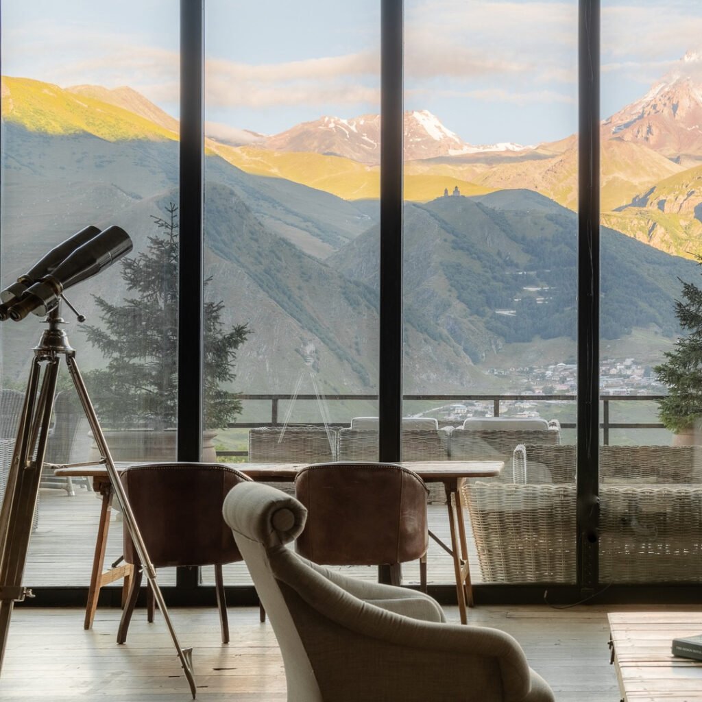 Rooms Hotel Kazbegi offers a breathtaking wedding venue nestled in the heart of Georgia’s Caucasus Mountains. Located in Stepantsminda, this boutique hotel combines rustic charm with modern elegance, providing an unforgettable backdrop for your special day.